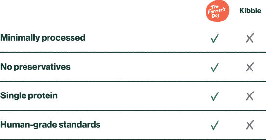 If you look at a bowlful of our fresh food versus a bowlful of kibble, the difference is glaring. One is filled with dozens of burnt brown balls, while the other contains whole meats and veggies that you can actually see. That’s because kibble is ultra-processed, resulting in dry pellets.